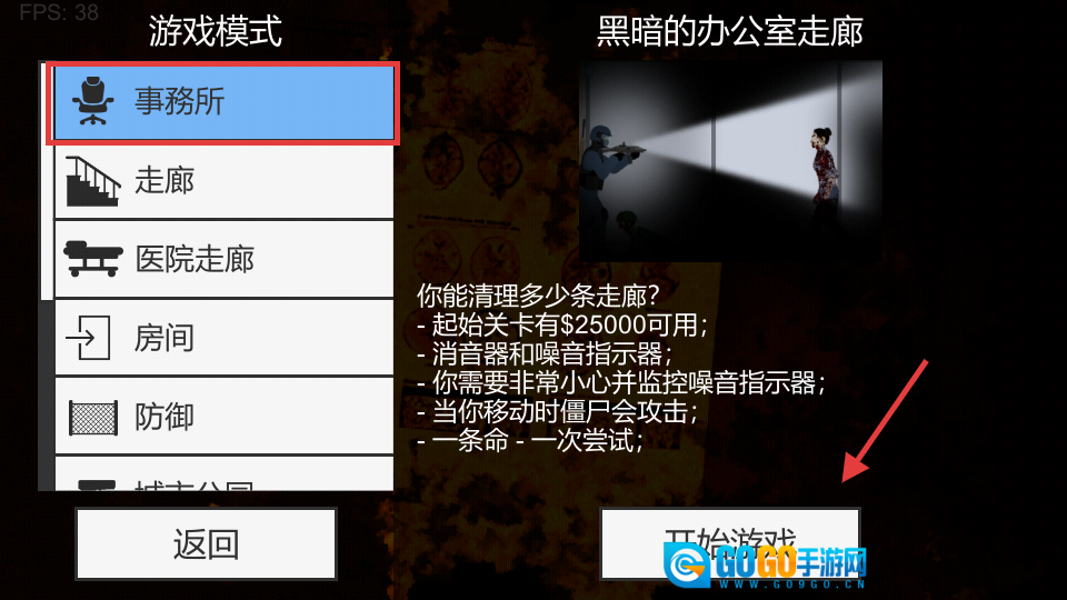 1. 挑选【事務所】模式,点击【开始游戏】进入关卡,初始拥有【$25000】,要留意监控噪音并谨慎移动。