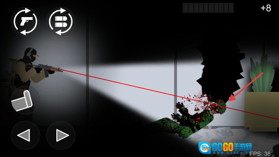 2、在战斗过程中,需瞄准僵尸进行射击,通过方向键来控制移动。当弹药不足时,点击换弹按钮。成功击杀一只僵尸,即可获得【+8】分数。
