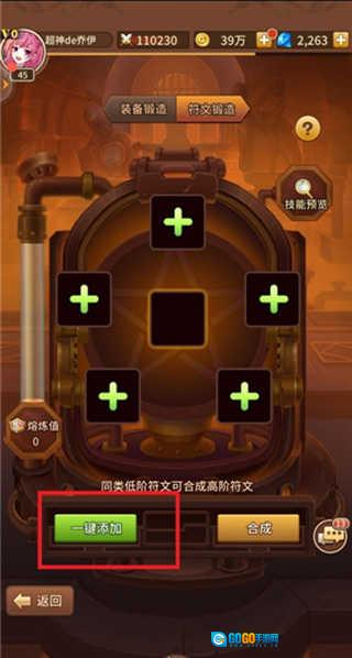 3、当进入符文锻造界面后,你会瞧见空白的槽位,在此处能够放置低等级符文,此外,也能直接点击下方的一键添加选项。