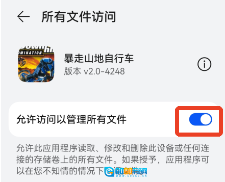 2、在系统权限管理界面开启【允许访问所有文件】的授权选项,确保金手指功能可以正常调用游戏数据。