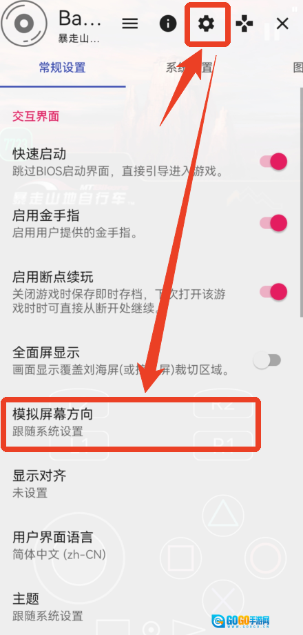 2、在设置菜单中找到齿轮形状的图标,进入后选择【模拟屏幕方向】选项。