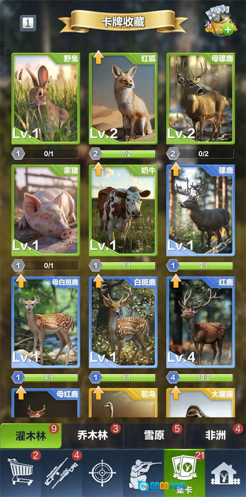 集卡系统是专为猎友们打造的动物卡牌收藏功能。猎友们每次狩猎都能收集卡牌碎片,用于解锁对应的动物卡牌。每张卡牌都具备独特的加成效果,通过升级卡牌还能强化其技能,这样在狩猎结束结算时就能获得更高的分数。