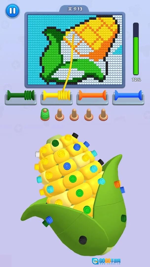 当三个同色的毛线团连成一线时,它们会自动消除,同时你将获得该颜色的使用权,用来创作独一无二的像素风格画作。