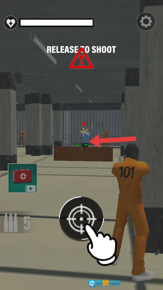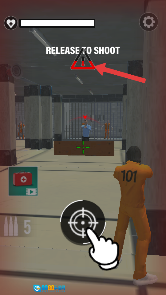 当屏幕上方出现持续射击的提示时,松开瞄准按钮即可开枪射击,要注意避开敌人周围的红色警告标识。