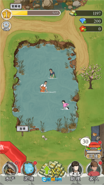 游戏开局只有一方小小的池塘,通过宣传推广吸引游客前来体验抓鱼的乐趣,用经营赚到的收益投入到鱼塘的升级改造中,逐步解锁更多新奇的水生生物种类,以此不断提升客人的游玩体验