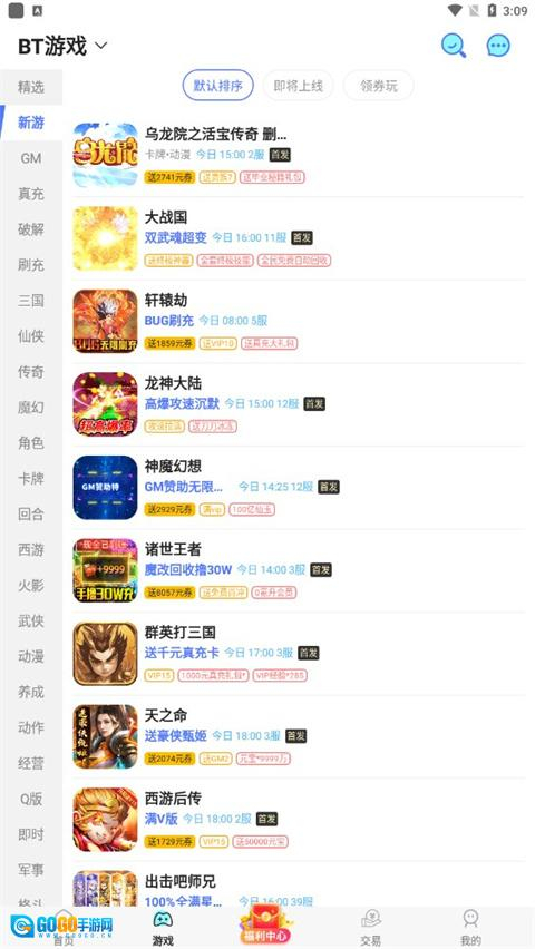 2、接着点击游戏选项,这里汇集了多种不同类型的游戏,像三国题材、仙侠风格、回合制玩法、火影主题等都包含在内。