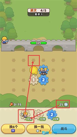 2、在【波次-4/5】【关卡1】中,消耗【10-钻石】兑换【1-级单位】后钻石剩【11-】,点击【战斗】推进,单位产出效率调整。