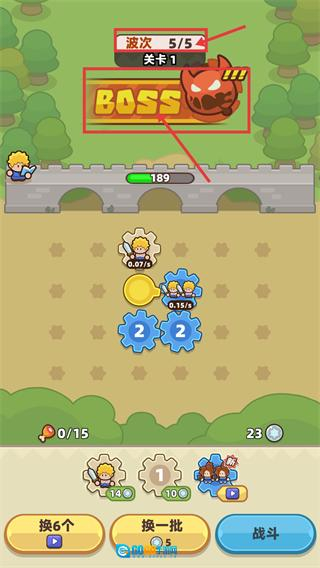 4、进入【波次-5/5】【关卡1】,触发【BOSS】战,当前城墙血量为【189-】,需集中单位战力应对最终波次的BOSS。