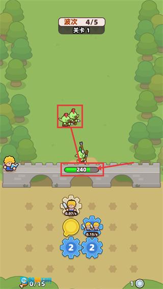 3、【波次-4/5】【关卡1】的战斗里,敌方怪物攻击使城墙血量降至【240-】,我方单位持续产出,需留意城墙血量状态。