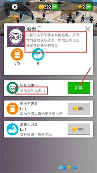 4、【追击手】具备袭击其他基地获取资源以及防御攻击的能力,点击【招募】按钮可【提升你的攻击力】,后续还能对其容量和力量进行升级。