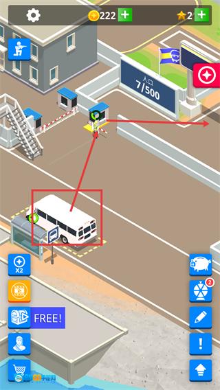 2、巴士抵达【公交站】并停靠后,点击闸口处的交互标识即可完成新兵接引操作,在此过程中【人口-7/500】与【金币-222】会同步更新,需要持续留意设施的实时状态。