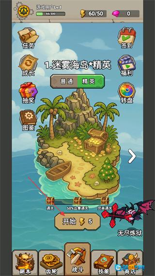 1、在游戏主界面选择迷雾海岛的精英难度,消耗体力值后点击开始按钮进入关卡。