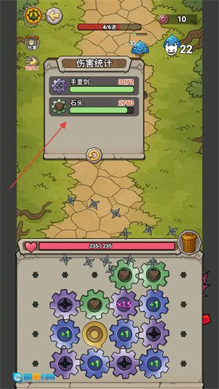 3、战斗过程中弹出的伤害统计界面,能查看手里剑和石头的输出数据,玩家可依据这些数据调整齿轮搭配,从而提升后续战斗的效率。