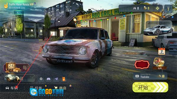 在俄罗斯乡村赛车手的主界面中,你可以点击车辆图标进入车辆选择界面,也能点击“开始”按钮进入模式选择环节,此外还可以通过界面上的功能按钮来进行辅助操作。