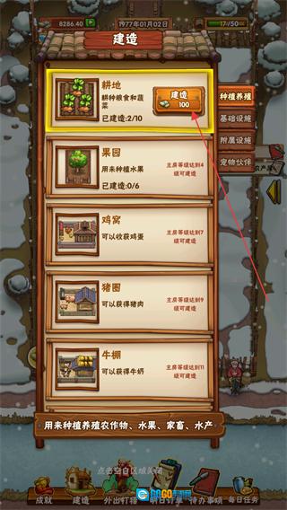 2、进入建造界面后,找到耕地选项并选中,花费100金币点击建造按钮,即可完成耕地的解锁操作。