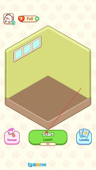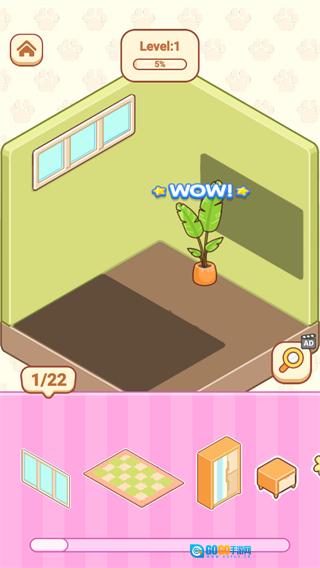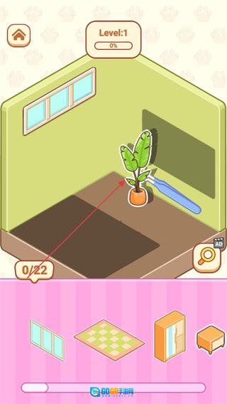 进入第一关后,从底部的家具栏里挑选物品,建议先摆放植物类装饰,再一步步布置房间,这样能推动关卡进度。