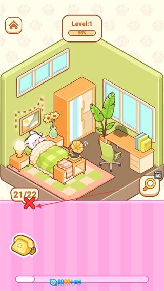 3、当查看上方进度条显示达到95%时,说明多数家具已布置完成;若有物品摆放位置错误,该物品会自动回到家具栏,同时出现红色叉叉符号提示。