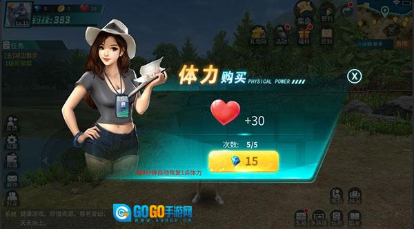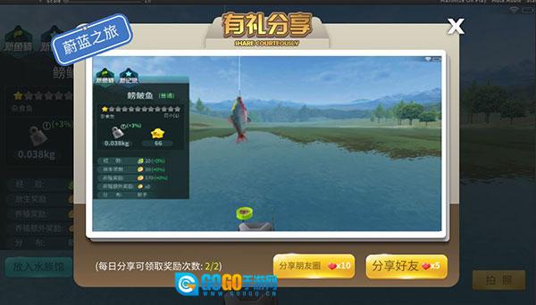 1、上鱼拍照:成功溜鱼后将鱼钓起即可点击拍照,单日最多可分享两次,分享至朋友圈可获得10点体力,分享给好友可获得5点体力(注意:仅限两次分享机会哦)。