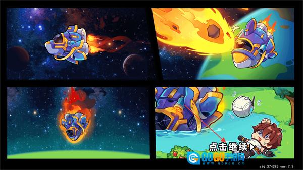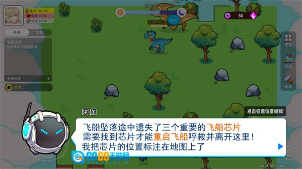1、进入恐龙小岛游戏页面,飞船遇险坠落的过程会以四格漫画的形式呈现,点击继续按钮就能进入游戏主界面,推动剧情和游戏进程。