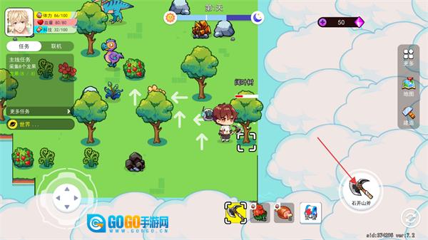 4、主线任务“采集8个龙果”已完成,角色现在能用石开山斧工具和场景元素互动,进行砍伐、采集资源的操作,以继续推进游戏探索与资源收集的进程。