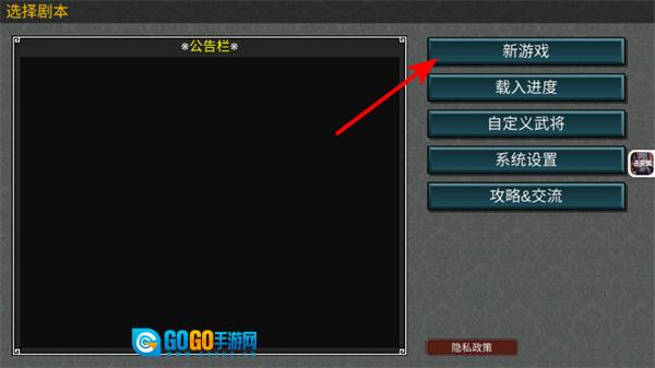 1、在游戏主界面点击新游戏按钮,即可进入剧本选择环节,这是开启三国策略玩法的基础操作,后续需要通过选择剧本、经营领地来推进势力发展。