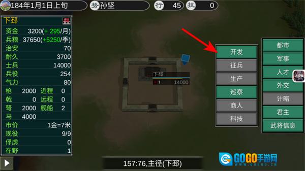 3、进入领地界面后,点击“开发”选项即可进入城池建设界面,这是提高领地资源产出(比如兵力、钱粮)的重要操作,坚持进行开发能够增强领地的经济与军事根基。
