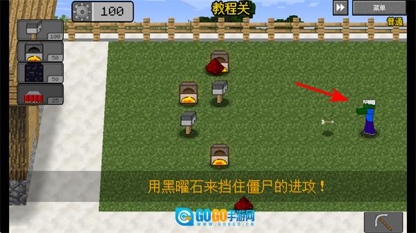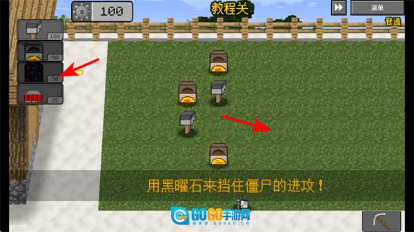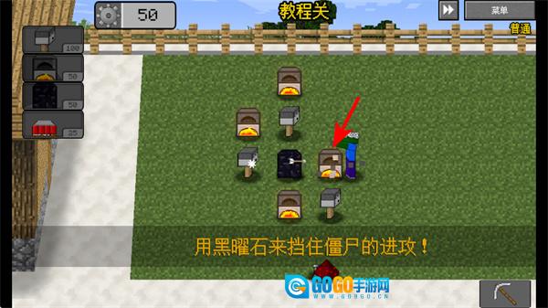 3、点击黑曜石卡牌即可选中这个阻挡类建筑,这是限制僵尸移动路线的关键步骤,合理摆放黑曜石能够把僵尸引导到攻击器械的射程里,从而提高作战效率。