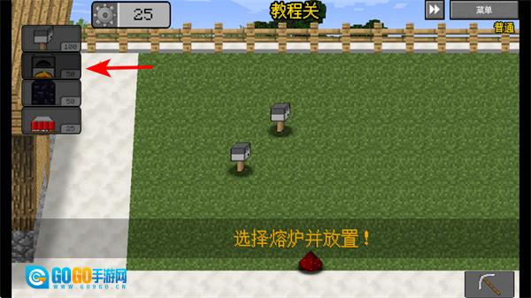 1、在教程关卡界面,点击左侧的熔炉卡牌即可选中该辅助装置,这是构建防御体系的补充步骤,熔炉可与攻击器械配合,提高战场资源的转化效率。