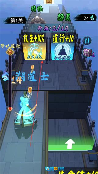 击败敌人后,选择“道行+10”的增益效果来提升角色属性,以便继续推进第1关的进程。