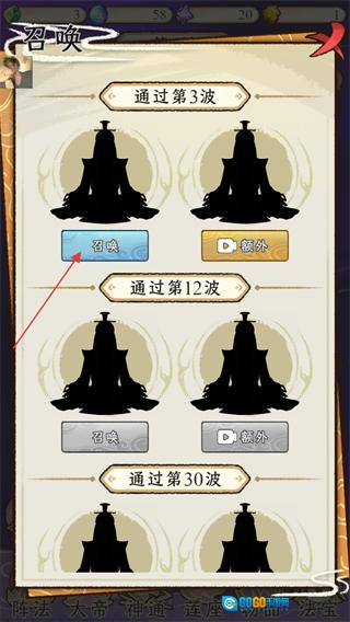 进入召唤界面后可查看不同的解锁条件:对应通过第3波的召唤按钮处于可点击状态,而对应通过第12波、第30波的召唤按钮暂未解锁,待达成相应条件后即可使用这些按钮的功能。