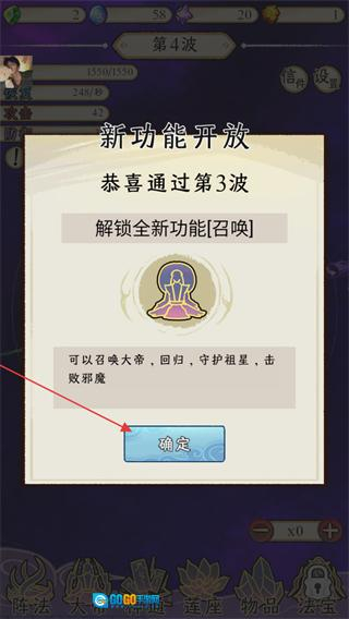1、通过第3波后,会弹出新功能开放的提示弹窗,弹窗会告知你解锁了全新的召唤功能,借助该功能可召唤大帝回归守护星,助力击败邪魇。