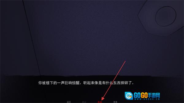 3、当看到剧情文本“你被楼下的一声巨响惊醒。听起来像是有什么东西摔碎了”时,点击自动按钮即可推进剧情。