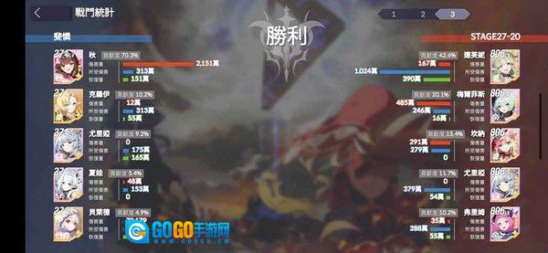 秋是我们的神级角色,也是唯一适配爆伤套的存在,她的强度可以参考乌鸦佬的分析文,这里就不展开了。放张图直观展示她的实力:扛伤最多、输出拉满,还能大量回血。不过使用时要注意,秋本身是前排站位,而且释放主动技或大招后会移动到敌方攻击力最高的角色身边,如果技能没能击杀对手,秋很容易被反杀,所以务必确认她使用技能时是否满足了打出最高伤害的条件。