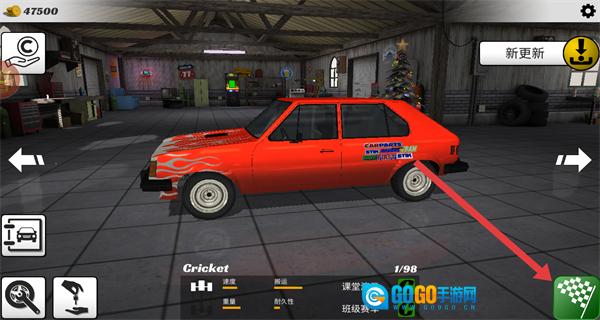 2、进入车库界面后,点击右下角的终点旗图标,即可打开游戏模式的选择界面。