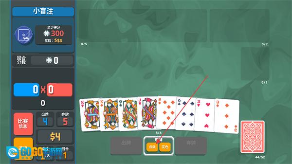 4、进入出牌阶段后,可选择手牌点击打牌来选定点数或花色,也能通过出牌、弃牌的操作推进回合进程。