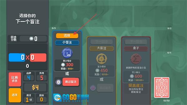 3、在选择下一个盲注的环节,你可以点击选择小盲注来参与盲注,也可以选择跳过盲注以推进游戏进程。
