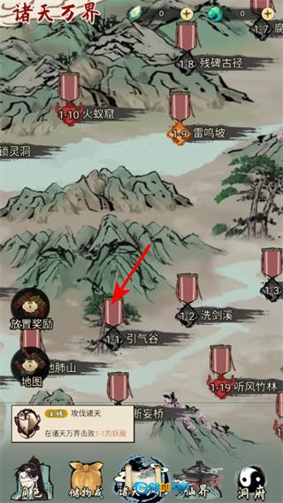 2、进入诸天万界地图界面后,选择对应的关卡区域如引气谷,这是进入战斗场景的基础操作,选择后会触发该区域的怪物挑战提示。