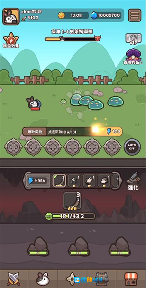 2、点击下方的装备可以对其进行升级,点击不同的矿石来获得经验,经验满后就可以提升装备等级。