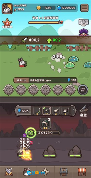 1、进入游戏后角色会自动攻击出现的怪物敌人,击败敌人可以获得金币。