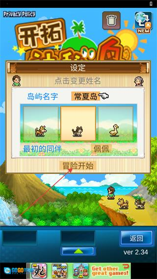 这是游戏的设定界面,你可以将岛屿名称设定为常夏岛,还能选定初始伙伴佩佩。等基础设定都完成后,点击界面里的“冒险开始”按钮,就能开启岛屿开拓的游戏环节了。
