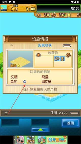 2、点击地图上的设施,就能查看该设施的收获物,以及它对周边文明、自然等属性产生的影响,借助这个界面可以知晓设施的功能和收益情况。