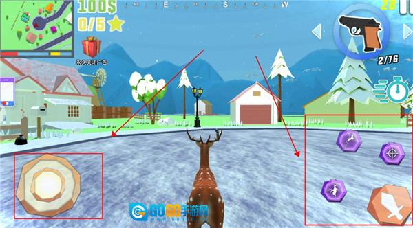 1、左侧轮盘用于操控方向,右侧的几个按钮则分别对应奔跑、跳跃、瞄准和攻击功能。