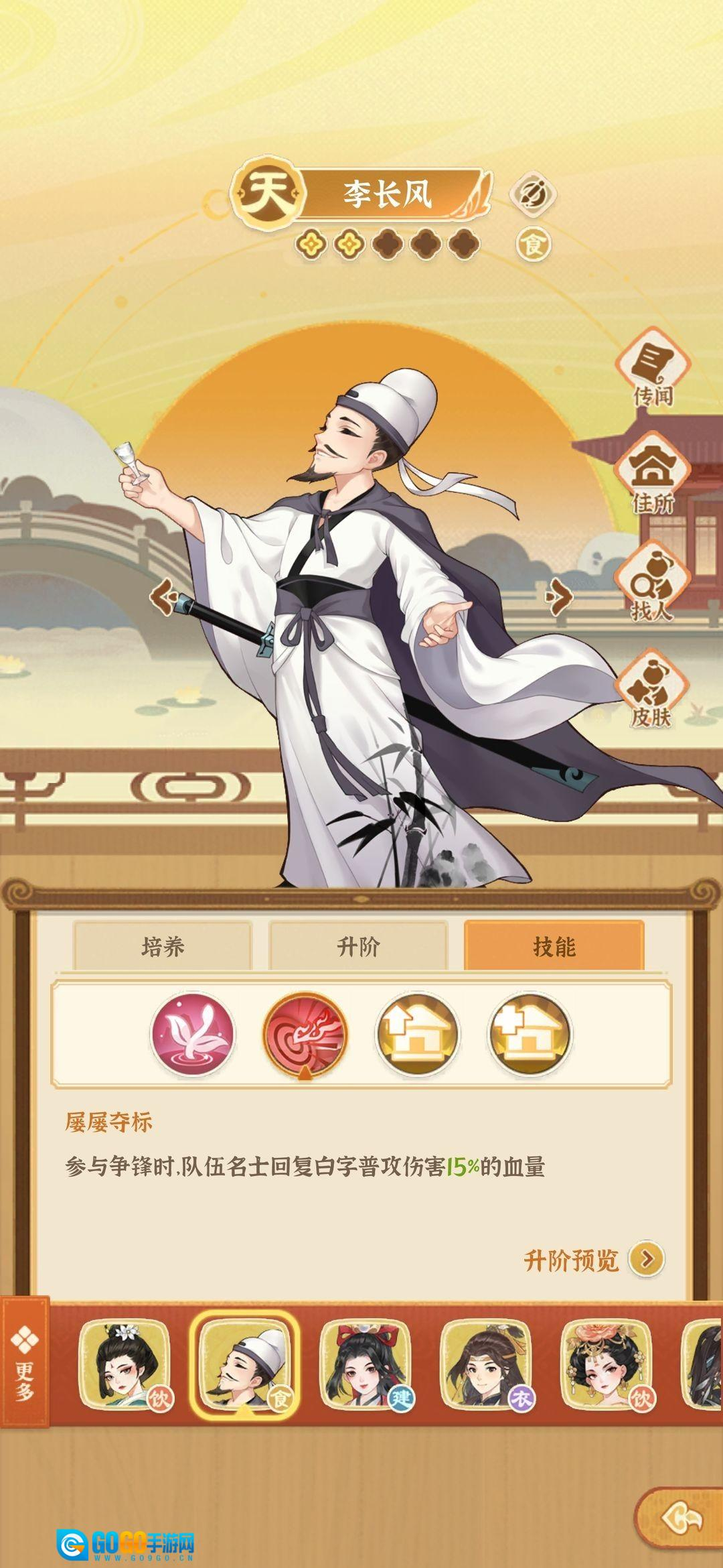 名士技能包含主技能、特殊技能与全局技能(此处以李长风为例)。升星加成的具体情况请在游戏内查看,所有名士的升星加成百分比是相同的。