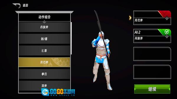 安装好游戏并进入后,在主界面我们可以先挑选武器和动作组合,选好后点击继续即可。