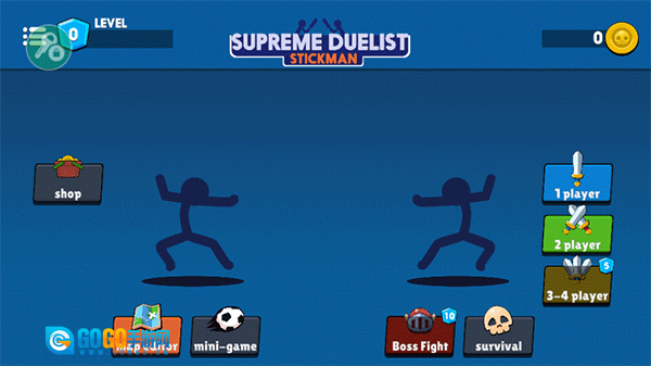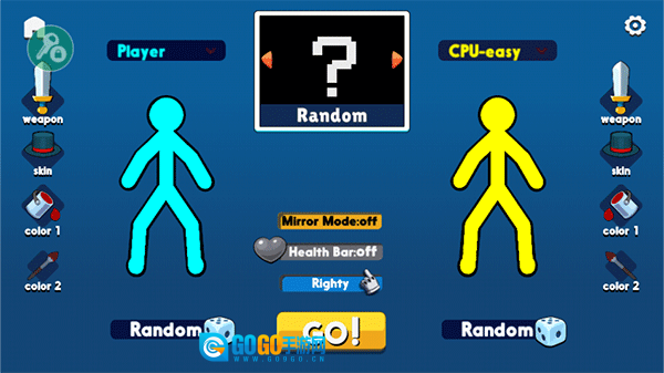 选好模式和人数后,会进入对局准备界面。在这里,玩家可以给火柴人更换装备、皮肤等;准备就绪后,点击“go”按钮就能进入游戏。
