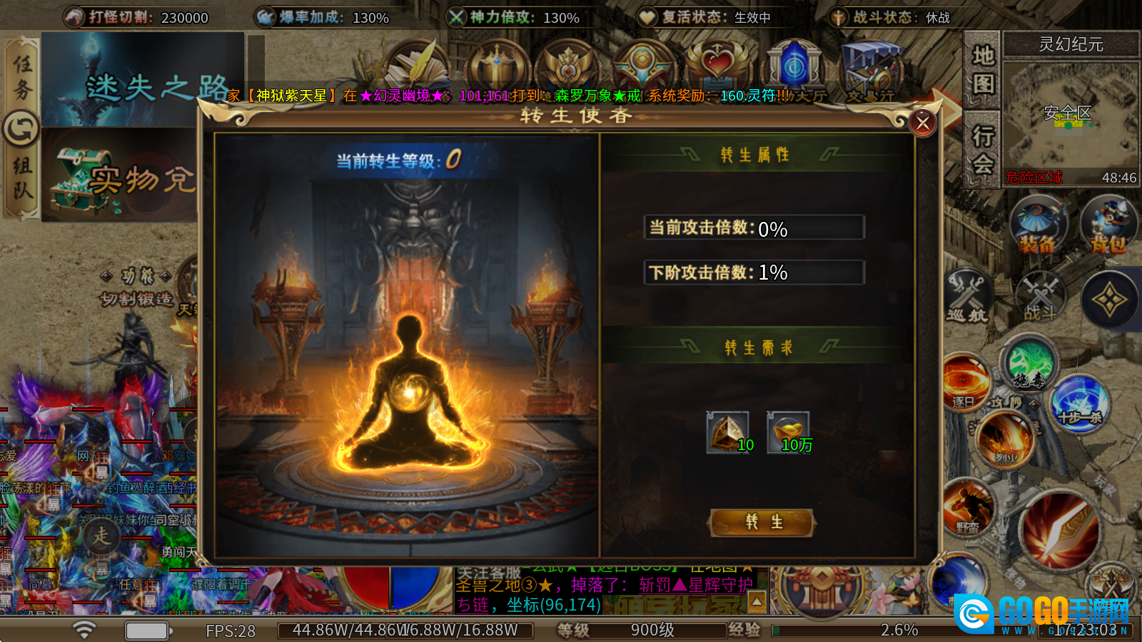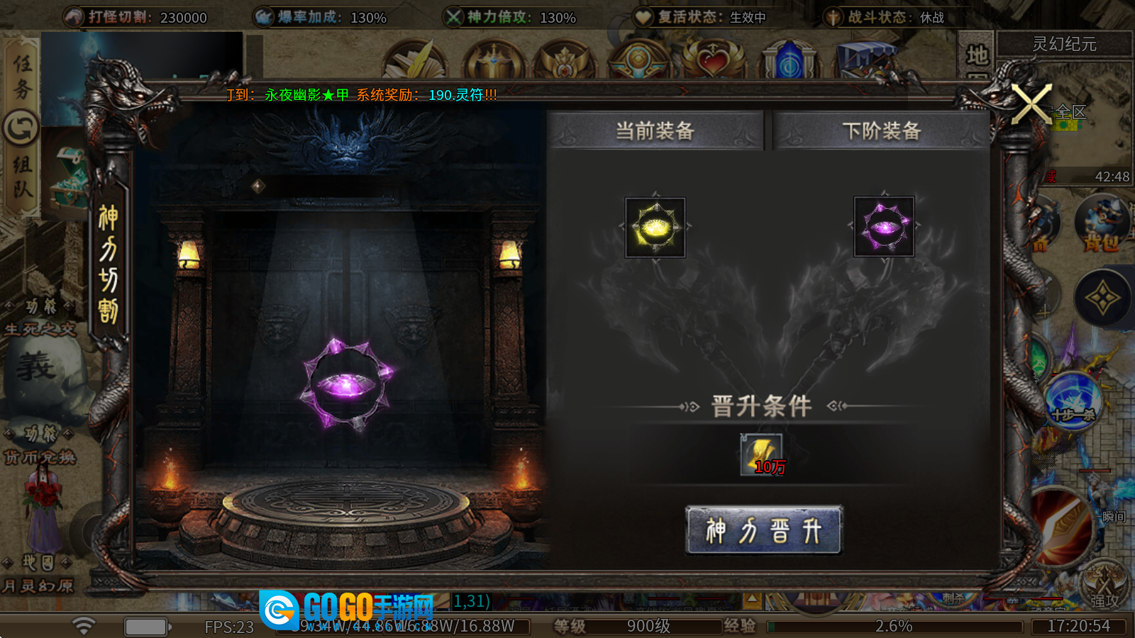 转生使者:消耗永恒圣石与元宝进行提升,每提升一级都能获得神力倍攻的加成。