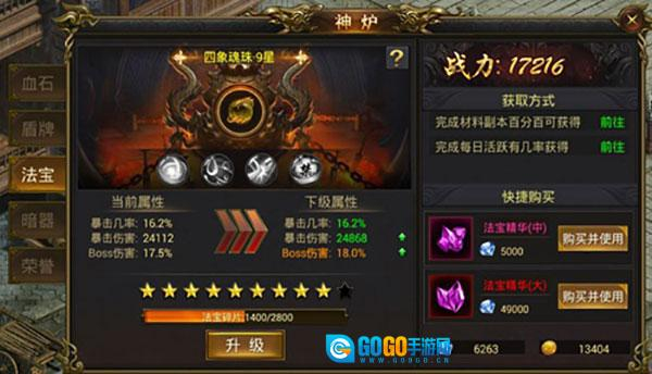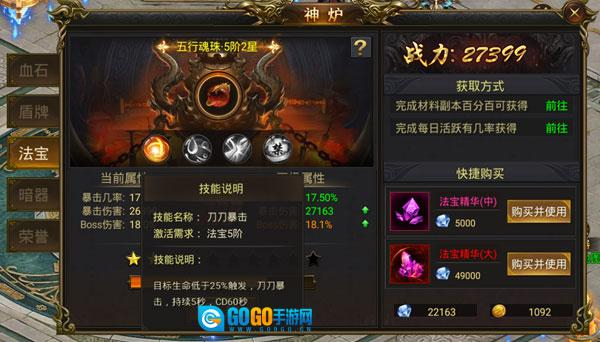 有句话叫攻击是最好的防守,在神炉中也不止有单纯提高生存力的功能。法宝可以助你进一步提高输出,增加暴击的几率和伤害,同时还能直接对BOSS造成一定伤害,在升级到5阶后,还能解锁新的技能。这些由法宝解锁的技能都和暴击相关,有些甚至还是PK专用的技能,获得后收益相当大,千万不要错过!