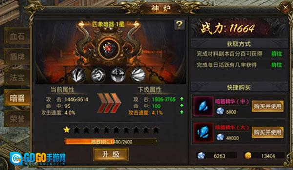 可大幅提升攻击力、命中和攻速,消耗暗器碎片可以升级暗器获得更高属性,暗器碎片可通过材料副本、击杀BOSS获得。