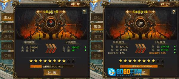 神炉中,血石和盾牌是最直接让大家站得稳的两个功能。升级血石会带来生命和闪避值的提升,而盾牌则能带来防御、攻击和一定概率的BOSS免伤效果。尤其闪避值提升和BOSS免伤,提升到极致后,轻松躲避各种攻击,还能有机会完全免伤,这样的效果加成,是不是听着就很吸引人呢?放心,升级血石和盾牌用的素材轻松做做日常和打BOSS都有掉落,不愁搞不到。