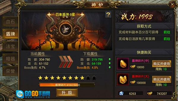 可大幅提升防御力、攻击力,盾牌碎片可通过回收装备、击杀BOSS等途径获得,提升盾牌可对BOSS伤害免疫。